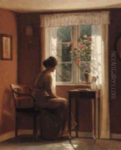 A Lady At A Window In A Pink Room