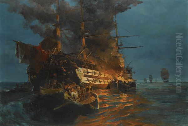 Konstantinos Volanakis’ The Burning of a Turkish Frigate is a dramatic seascape that captures a pivotal moment of tension and brilliance. The painting depicts a blazing warship engulfed in flames, its fiery reflection dancing violently across the dark waters, while distant ships loom ominously under a smoke-filled sky. Volanakis, a key figure in 19th-century Greek maritime art, masterfully blends realism with romanticism, emphasizing both historical significance—likely referencing Greece’s War of Independence—and emotional intensity. His meticulous attention to light, particularly the contrast between the ship’s inferno and the surrounding gloom, showcases his academic training and affinity for seascapes. This work not only solidifies his reputation as Greece’s foremost marine painter but also serves as a compelling example of how 19th-century European art merged nationalism with aesthetic grandeur. Historically, it reflects Greece’s maritime struggles, making it culturally resonant beyond its artistic merit.