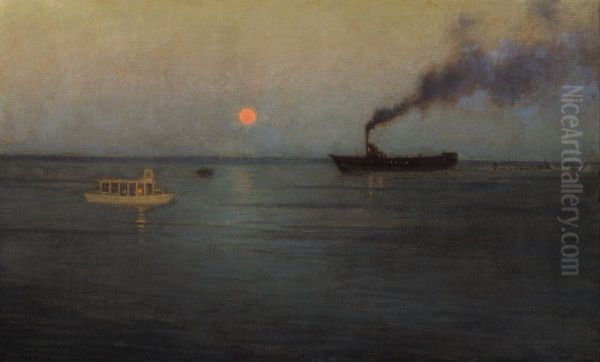 Rosy Moon Off Charleston Harbor by L. Birge Harrison is a luminous example of American Tonalism, capturing the serene beauty of Charleston’s harbor bathed in the soft glow of twilight. Painted in the late 19th or early 20th century, Harrison’s work masterfully blends muted hues and delicate light effects, evoking a dreamlike tranquility. The scene features a rosy-hued moon reflected on calm waters, with distant ships and silhouetted trees adding depth and poetic subtlety. As a prominent Tonalist, Harrison was influenced by Barbizon School aesthetics and James McNeill Whistler’s atmospheric harmonies, emphasizing mood over detail. This painting exemplifies his skill in conveying nature’s quiet splendor and holds historical significance as part of the Tonalist movement, which bridged Romanticism and early Modernism in American art. Its meditative quality reflects the era’s fascination with introspection and the sublime in everyday landscapes.