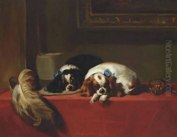 Sir Edwin Landseer’s King Charles Spaniels (1845) is a masterful portrayal of canine charm and regal elegance, radiating warmth and intimacy through its meticulous detail. The painting, featuring two Cavalier King Charles Spaniels nestled together on a plush red cushion, showcases Landseer's signature realism and ability to capture the expressive innocence of animals. Set against a dark, muted background, the dogs’ silky coats and soulful eyes draw immediate attention, creating a sense of quiet companionship. The work reflects Victorian England’s fascination with pet portraiture and Landseer’s unparalleled skill in animal painting, securing his reputation as one of the 19th century’s most beloved artists. Its historical significance lies in bridging aristocratic luxury with universal affection for pets, making it an enduring icon of animal art.