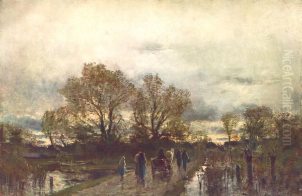 Laszlo Mednyanszky’s Marshland is a hauntingly atmospheric landscape that captures the melancholic beauty of nature with profound sensitivity. Painted in the late 19th or early 20th century, the work exemplifies Mednyanszky’s signature style—a blend of realism and moody symbolism—revealing his fascination with solitary, transient moments in the natural world. The muted palette of grays, soft greens, and somber browns evokes a sense of quiet desolation, while the loose, expressive brushwork conveys movement in the reeds and water, as if the scene is caught between mist and light. Mednyanszky, often called "the painter of the night," was unappreciated in his lifetime but later recognized as a bridge between Romanticism and early Modernism, influencing Central European artists with his emotionally charged realism.