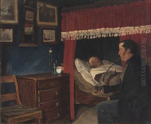 "Hvordan gaar det, gamle. Til h. i en Stue sidder en Mand med Pibe i Munden ved en Alkoveseng med rodt Forhaeng. I Sengen ligger en syg Mand"
