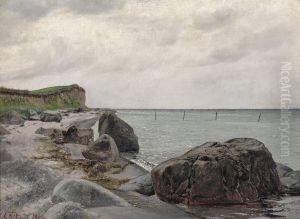 Strandparti ved Eno med store sten i forgrunden. I baggrunden vandet. Lys himmel med lette skyer.