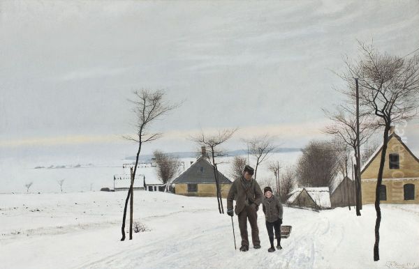 Laurits Andersen Ring’s Foggy Winter Day in Vindero (1900) is a captivating example of Danish Symbolism and early modernism, blending moody atmospherics with social realism. The painting depicts a muted winter landscape in Vindero, Denmark, enveloped in a thick, ethereal fog that obscures distant trees and softens the contours of the barren fields. Ring’s masterful use of cool grays and pale blues evokes a quiet melancholy, heightened by the solitary figure—a young girl walking along a path—introducing a poignant human element. As a leading figure of the Skagen Painters and later symbolism, Ring infused ordinary rural scenes with psychological depth, reflecting Denmark’s socio-economic transitions at the century’s turn. This work exemplifies his unique synthesis of naturalism and emotional narrative, cementing his legacy as a bridge between 19th-century realism and 20th-century expressionism in Scandinavian art.