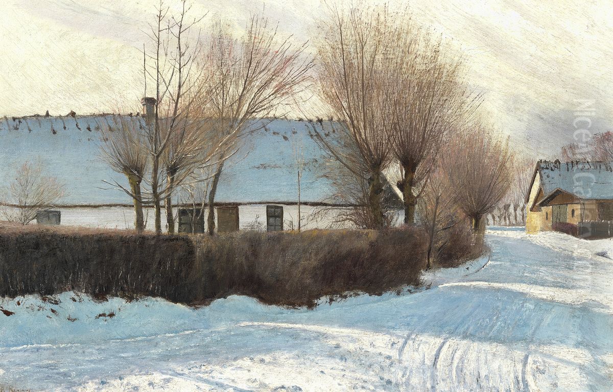 Laurits Andersen Ring's Snedaekt vej i Baldersbronde med staerke skygger fra et hvidkalket, strataekt hus (Snow-Covered Road in Baldersbronde with Strong Shadows from a Whitewashed, Thatched House) encapsulates the serene yet melancholic beauty of rural Denmark in winter. Painted in 1913, this work exemplifies Ring's mastery in capturing the interplay of light and shadow, where the stark white snow contrasts dramatically with the elongated shadows cast by a humble thatched cottage. The composition, with its clean lines and subdued palette, reflects Ring's transition from Social Realism to Symbolism, infusing everyday scenes with deeper emotional resonance. As a pivotal figure in Danish art, Ring bridged 19th-century naturalism and early modernism, and this painting is a testament to his ability to evoke quiet introspection through seemingly simple landscapes. Its historical significance lies in its portrayal of Danish rural life, offering a timeless snapshot of harmony between humanity and nature.