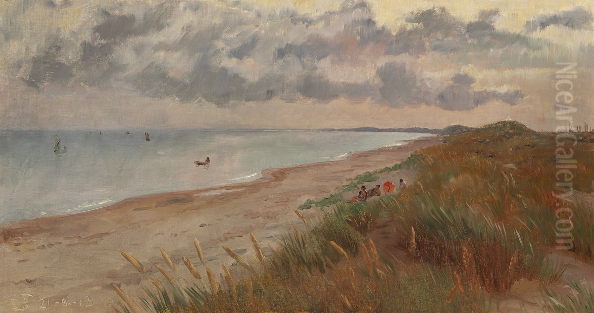Laurits Tuxen’s Strandparti med figurer (Beach Scene with Figures) is a vibrant portrayal of leisurely coastal life in the late 19th or early 20th century. The painting captures a sunlit beachscape, where elegantly dressed figures engage in relaxed conversation and seaside strolls, evoking a sense of genteel serenity. Tuxen, a Danish painter associated with the Skagen group, was renowned for his ability to blend natural light with sociable intimacy, influenced by French Impressionism yet grounded in Scandinavian realism. The work reflects the bourgeois idyll of the era, where coastal resorts became symbols of refined leisure. Historically, Tuxen’s seaside scenes are significant for bridging academic traditions with modern plein-air techniques, offering a glimpse into the evolving European art scene before the avant-garde upheavals of the early 20th century.
