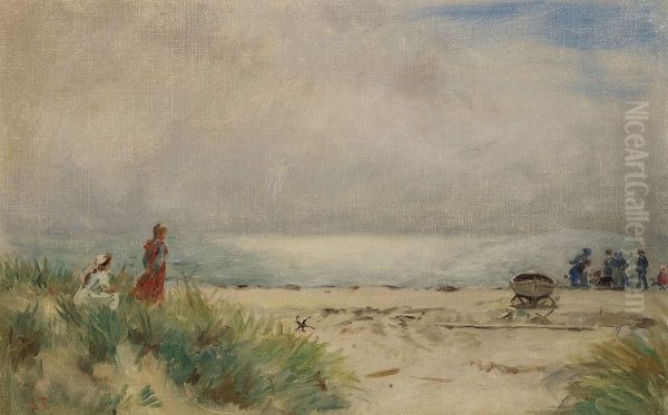 The captivating painting "To smapiger i klitterne på Skagen strand" by Laurits Tuxen (1893) transports viewers to the luminous dunes of Skagen, Denmark, where two young girls in crisp white dresses become one with the windswept landscape. A masterful example of the Skagen Painters' movement, Tuxen's work shimmers with the characteristic Nordic light that defines this artist colony's oeuvre - where golden sands merge seamlessly with foamy shorelines under vast, breezy skies. The artist's meticulous brushwork in capturing transparent fabrics rippling in coastal winds shows his academic training, while the spontaneous plein-air vibe places it firmly within late 19th-century naturalism. This painting holds particular art historical significance as it bridges Tuxen's official royal portraiture works with his more intimate Skagen studies, showcasing his dual mastery of formal composition and lyrical atmosphere.
