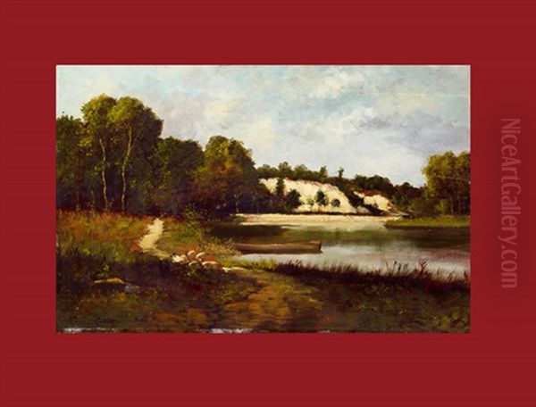 Leon Richet’s Flusslandschaft (River Landscape) is a serene yet evocative depiction of nature’s tranquility, showcasing the artist’s mastery in capturing the interplay of light, water, and foliage. Painted in the late 19th or early 20th century, Richet’s work exemplifies the plein air tradition, blending Impressionist brushwork with a subtle tonal realism reminiscent of the Barbizon School. The scene unfolds along a quiet riverbank, where dappled sunlight filters through dense trees, reflecting softly on the water’s surface. Richet’s delicate handling of color and texture—soft greens, muted blues, and earthy browns—creates a harmonious balance, inviting viewers into a moment of quiet contemplation. Though less famous than his mentor Rosa Bonheur, Richet’s landscapes hold a distinct place in 19th-century European art, bridging Romanticism’s emotional depth with the emerging naturalism of his era. Flusslandschaft embodies this transition, offering both escapism and a refined study of atmospheric effects.