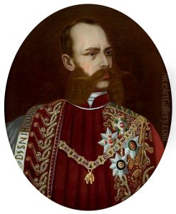 For display, this portrait demands a setting that complements its stately gravitas. A formal study or executive office with wood-paneled walls and classic furnishings would enhance its regal aura, while a curated gallery wall in a high-ceilinged entryway could juxtapose it with other 19th-century works for thematic cohesion. Opt for frames in ornate gold or dark walnut to harmonize with its warm palette, avoiding overly modern designs that might clash. Given its likely sizable dimensions (typical of ceremonial portraits), ensure ample wall space—placing it above a console table or fireplace mantel will anchor it as a focal point. Soft, directional lighting can heighten the texture of brushstrokes, while adjacent decor in deep burgundy or olive green will subtly echo its colors without competing for attention. The artwork’s historical weight makes it ideal for spaces where sophistication and legacy are prized.