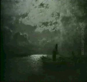Under the mystical glow of a silver moon, Helle Mondnacht An Einer Flussmündung ("Bright Moonlit Night at a River Mouth") by Louis (Carl Ludwig) Douzette (1834–1924) transports viewers to a serene nocturnal landscape. A master of German Romanticism and later Impressionism, Douzette was celebrated as the "Moonlight Painter" for his hauntingly luminous depictions of twilight and moonlit scenes. This work exemplifies his signature style, where soft brushstrokes blend sky and water into an ethereal dreamscape, bathed in silvery-blue tones. Painted in the late 19th century, it reflects the era’s fascination with nature’s sublime moods, bridging Romantic emotionality and Impressionist light studies. While less internationally recognized than contemporaries like Caspar David Friedrich, Douzette’s works hold a niche significance in Northern European nocturne painting, prized for their poetic tranquility and technical mastery of low-light atmospheres.