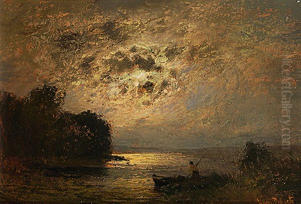Under the spell of a silvery moon, Seelandschaft Mit Kahn Bei Mondschein (Moonlit Lake Landscape with Boat) by Carl Ludwig Douzette (1834–1924) transports viewers to a watery realm where nature whispers in twilight. A master of German Romantic landscapes, Douzette earned the moniker "Moonlight Douzette" for his ethereal nocturnal scenes. This work exemplifies his signature style — delicate gradations of indigo and pearl capture the stillness of a lake, where a solitary boat dissolves into the misty shoreline. Painted during late 19th-century Europe’s fascination with atmospheric moods, it bridges Romanticism’s emotional depth with early Impressionism’s light studies. Though less renowned than Caspar David Friedrich, Douzette’s moonlit vignettes remain prized for their poetic restraint, influencing later Symbolist painters who sought to evoke the ineffable.