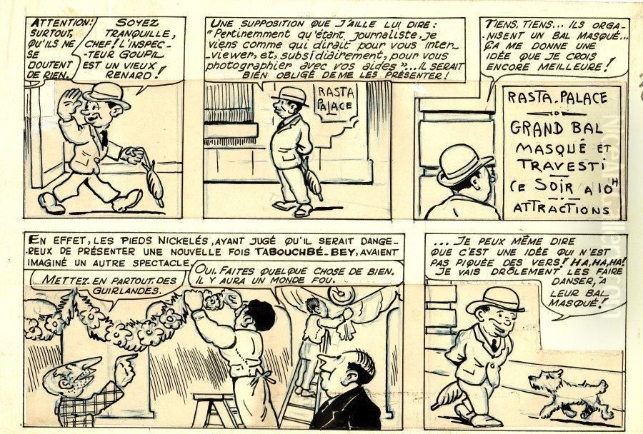 For decorating spaces, framed prints of "Les Pieds Nickelés" panels would inject playful energy into creative offices or eclectic living rooms. Ideal for mid-century modern or industrial interiors, the black-and-white ink drawings would pop against exposed brick or deep-hued walls (try navy or olive green). Cluster three smaller panels (approximately 12x16 inches) asymmetrically above a velvet sofa for graphic contrast, or opt for a large-scale single image (24x36 inches) as a statement piece in a home office paired with vintage wooden shelves. Complement the monochrome artwork with mustard yellow or Bordeaux red accents—think throw pillows or ceramic vases—to echo the comic’s retro Parisian vibe. Avoid overly formal settings; this is best suited to spaces celebrating humor and nostalgia.