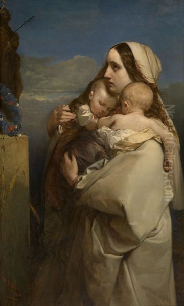 The Unfortunate Mother by Louis Gallait is a poignant 19th-century masterpiece that exemplifies Romanticism's emotional depth and social consciousness. Painted in 1855, the work depicts a grief-stricken mother cradling her dying child amidst war's devastation, its somber palette of umbers and grays amplifying the tragedy. Gallait's meticulous realism—seen in the mother's torn garments and exhausted posture—belongs to the Belgian historical painting tradition, bridging Rubens' dramatic vigor with modern humanitarian themes. This painting gained significance as part of Europe's growing 19th-century discourse on war's civilian consequences, showcased alongside Delacroix and Géricault's works in Paris salons. The delicate sfumato on the child's face contrasts with the sharp anguish in the mother's eyes, creating an unforgettable duality of tenderness and despair that established Gallait as a master of narrative pathos.