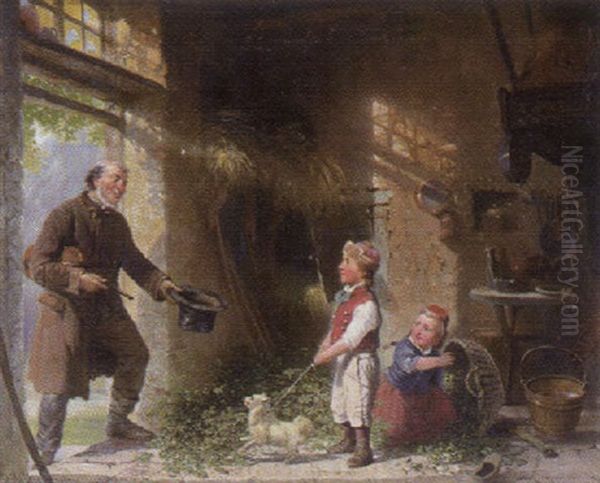 Ein Bettelmusikant Bei Spielenden Kindern Am Eingang Einer Scheune
