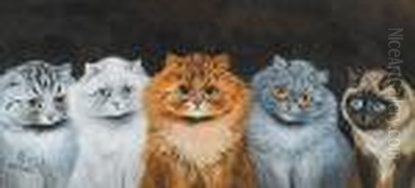 "Five Cats" by Louis Wain is a whimsical yet profound example of the artist's signature anthropomorphic feline portrayals, created during his most celebrated period in the late 19th to early 20th century. The painting radiates playful energy through its intricate patterning and kaleidoscopic use of color, as five wide-eyed cats with human-like expressions cluster together in a dynamic composition. Wain's distinctive Art Nouveau-inspired style blends decorative motifs with psychological depth, reflecting both his fascination with feline behavior and his own evolving mental state (he would later develop schizophrenia). This work represents a pivotal moment in art history where commercial illustration met fine art - Wain's cats became cultural icons, transforming public perception of animals in art while foreshadowing modern psychological art movements. The vibratory quality of the patterned fur and hypnotically enlarged eyes create an almost psychedelic effect decades before such styles became mainstream.