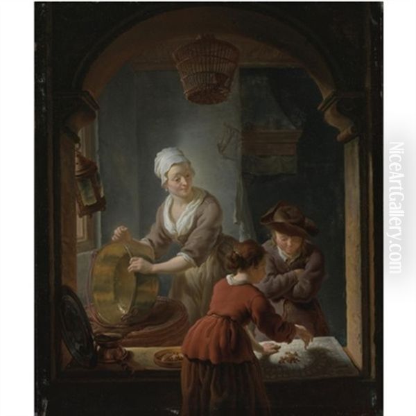 An Interior With A Kitchen Maid Cleaning A Copper Pot And A Youth And Young Woman Playing Jeu De L'oie