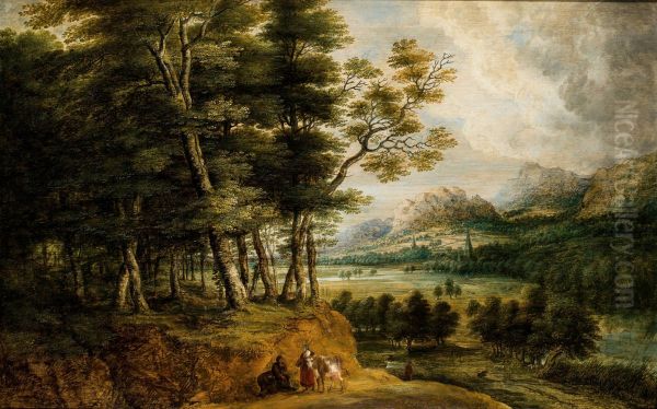 Extensive wooded landscape, drovers with their cattle in the foreground