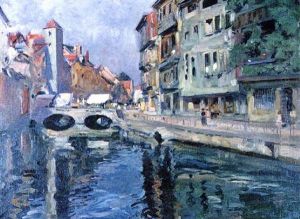 Lucien Hector Jonas' Ville D'Annecy captures the picturesque charm of the French Alpine town bathed in serene luminosity. Painted in the early 20th century, this work exemplifies Jonas’ academic realism blended with subtle impressionist influences—visible in his delicate handling of light reflecting off the Thiou River and the soft, atmospheric rendering of medieval architecture. As a student of Léon Bonnat and an official military painter during WWI, Jonas balanced precise draftsmanship with poetic sensibility, making this piece a notable bridge between traditional and modern French landscapes. The painting’s composition, with its arched bridge framing pastel-hued buildings and mirror-like water, evokes tranquility while showcasing Annecy’s nickname as the "Venice of the Alps." Though less celebrated than Monet’s water scenes, Jonas’ work holds significance for its documentary elegance and embodiment of early 1900s European plein-air revival.
