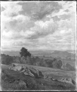 Immerse yourself in the idyllic serenity of Ludwig Christian Wagner’s Rhonlandschaft, a 19th-century German landscape painting that captures the pastoral charm of the Rhön region. With its softly rolling hills, delicate play of light, and meticulous attention to natural detail, Wagner’s work embodies the Romantic tradition’s reverence for nature, blending poetic lyricism with realistic precision. Historically, Wagner’s landscapes reflect the Biedermeier era’s introspective appreciation of regional scenery, offering a quiet counterpoint to the dramatic grandeur of contemporaneous Romantic works. Though less widely known than his peers like Caspar David Friedrich, Wagner’s contributions to German landscape painting are celebrated for their intimacy and atmospheric harmony, making Rhonlandschaft a subtle yet evocative masterpiece.