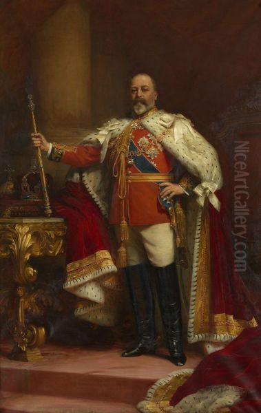 The portrait King Edward VII (1841-1910) by Sir Luke Fildes exudes regality and dignified warmth, capturing the monarch seated in an opulent interior bathed in rich, golden tones. Painted posthumously between 1911-1912, Fildes employs his mastery of realist portraiture—honed through decades as a celebrated Victorian illustrator—to immortalize the beloved king with lifelike precision. The composition balances grandeur with approachability: Edward VII’s relaxed posture and direct gaze convey authority softened by his renowned charm, while sumptuous fabrics and gilded details affirm his status. Commissioned as part of a national memorial, the work reflects the Edwardian era’s transition from rigid Victorian formalism to a more intimate, psychologically nuanced style. Today, it remains a definitive image of the monarch, emblematic of Fildes' role in bridging academic tradition and emerging modernity in British portraiture.