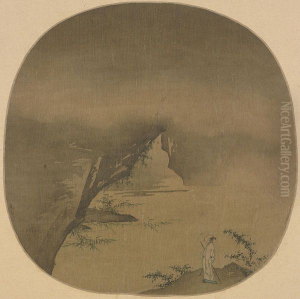 Ma Yuan's Waiting for Guests by Lamplight (《马远石壁看云棪页》) exemplifies the poetic minimalism of Southern Song dynasty painting. This exquisite album leaf, created circa 1200 AD, captures a scholar reclining beneath gnarled pines on a misty mountainside - his contemplative pose framed by Ma Yuan's signature "one-corner" composition. The artist's masterful use of negative space transforms silk into palpable atmosphere, where ink-wash gradients suggest swirling clouds eroding jagged cliffs. As a leading figure of the Ma-Xia School, Ma Yuan perfected this evocative style that influenced centuries of East Asian ink painting. The work's delicate equilibrium between human presence and nature's grandeur reflects Song Neo-Confucian ideals, while its restrained brushwork showcases the era's shift from decorative realism to philosophical suggestion. Now housed in Taipei's National Palace Museum, this piece represents a pinnacle of literati painting's ability to convey profound thought through deliberate emptiness.