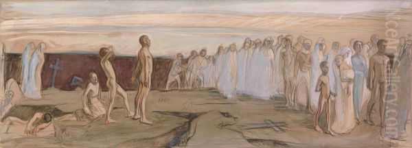 Magnus Enckell’s Uppstandelsen, skiss till altartavlan i Tammerfors domkyrka (Resurrection, Sketch for the Altarpiece in Tampere Cathedral) is a mesmerizing work that radiates ethereal luminosity and spiritual transcendence. Painted in 1906–07, this preliminary sketch for Tampere Cathedral’s altarpiece embodies Enckell’s unique blend of Symbolism and early Modernism, characterized by its soft yet luminous palette and fluid, almost dreamlike forms. The painting captures the resurrection theme with figures bathed in celestial light, their elongated bodies and serene expressions evoking a sense of divine harmony. Enckell, a leading Finnish artist, played a pivotal role in introducing Symbolism to Nordic art, and this work showcases his mastery of conveying profound spiritual narratives through delicate tonal transitions and rhythmic compositions. It remains a significant piece in Scandinavian art history, bridging the gap between traditional religious iconography and modern emotional expression.