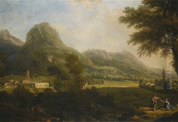 Marco Ricci's A Mountainous Landscape With A Walled Town At The Left (early 18th century) immerses viewers in a dramatic, theatrical vista characteristic of the Venetian Baroque. The painting captures a rugged mountain terrain bathed in soft, luminous light, with a fortified town nestled along the left edge, suggesting both human resilience and nature’s grandeur. Ricci, renowned for his capriccios (imaginary landscapes), blends realism with poetic license, showcasing his mastery of atmospheric perspective—layers of receding hills dissolving into a hazy distance. The work reflects the era’s fascination with idealized nature and romanticized ruins, influenced by Salvator Rosa’s wild landscapes. As a pivotal figure in Venetian landscape painting, Ricci bridged the theatricality of Baroque and the nascent Romantic sensibility, making this piece a testament to his role in evolving European landscape traditions.