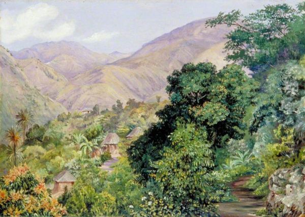 Marianne North’s Distant View of Newcastle, Jamaica (1871) is a vibrant and immersive depiction of the verdant Caribbean landscape, capturing the lush hills of Jamaica with remarkable detail and warmth. Rendered in North’s signature bold, almost luminous brushstrokes, the painting exudes a sense of tropical abundance, with rich greens and earthy tones conveying the untamed beauty of the island. As one of the few female botanical artists of the Victorian era, North traveled independently to document exotic flora, and this work reflects her keen observational skills and passion for natural splendor. The painting stands as a testament to her unique position in art history—bridging scientific illustration and plein-air Romanticism—while offering a rare colonial-era perspective through an ecological lens. Its historical significance lies in both its documentary precision and its evocative, almost dreamlike atmosphere, making it a standout in North’s extensive collection at London’s Kew Gardens.