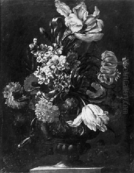 Mario Nuzzi's Still Life of Flowers in an Urn (c. 17th century) is a Baroque masterpiece that radiates opulence and vitality. Bursting with meticulously detailed blooms—roses, tulips, peonies—the composition spills luxuriously from an ornate urn, their petals rendered with almost scientific precision yet throbbing with life. Nuzzi, nicknamed "dei Fiori" for his floral expertise, elevates still life beyond decoration; his interplay of light and shadow (chiaroscuro) draws the eye across velvety textures and translucent leaves, while a dark background heightens the flowers’ luminosity. As a leading figure in Rome’s 17th-century still-life revival, his works bridged Dutch realism and Italian theatricality, influencing generations. This painting isn’t merely botanical documentation—it’s a memento mori draped in splendor, whispering of beauty’s fleeting grace.