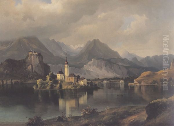 Veldeser See by Marko Pernhart is a breathtaking mid-19th-century landscape painting that immerses the viewer in the serene beauty of Lake Bled (Veldeser See) in Slovenia. Pernhart, a pioneering Slovenian realist, captures the lake’s glassy surface reflecting the surrounding Alps, with the iconic Bled Island and its medieval church adding a poetic focal point. His meticulous brushwork and naturalistic palette—soft blues, lush greens, and golden sunlight—evoke tranquility and reverence for nature. As one of the first artists to document the Slovenian landscape in oils, Pernhart bridged Romanticism’s emotive grandeur with early realism’s precision, making this work historically significant. The painting is a testament to Europe’s rising nationalism, as artists like Pernhart celebrated local geography to foster cultural identity.