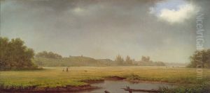 Martin Johnson Heade’s Cloudy Day, Rhode Island (c. 1866–75) is a serene and evocative landscape that captures the quiet drama of nature under subdued skies. Known for his luminist style—a precursor to American Impressionism—Heade masterfully renders the interplay of light and atmosphere, infusing the scene with a poetic stillness. The painting depicts a coastal expanse under overcast skies, where muted greens, grays, and earth tones create a harmonious, almost meditative mood. Unlike his vibrant tropical bird-and-flower works, this piece reflects his fascination with New England’s shifting weather, showcasing his ability to convey mood through subtle tonal gradations. Though less celebrated than his exotic themes, Cloudy Day, Rhode Island exemplifies Heade’s technical precision and his role in shaping 19th-century American landscape painting, bridging the Hudson River School’s grandeur with luminism’s quiet introspection.