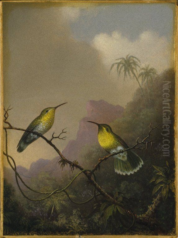 Martin Johnson Heade’s Copper-tailed Amazili (c. 1863–1864) is a luminous tribute to the hummingbird’s delicate beauty amidst lush tropical foliage. Executed during Heade’s prolific Brazilian period, the painting exemplifies his unique fusion of scientific precision and romantic atmosphere—qualities that distinguish him from his Hudson River School contemporaries. Bathed in warm, diffused light, the composition captures a fleeting moment of stillness, with the iridescent plumage of the hummingbird shimmering against velvety green leaves. Heade’s attention to botanical accuracy coexists with a dreamlike softness, reflecting his fascination with exotic landscapes and their interplay of light and texture. Though underappreciated in his lifetime, Heade’s avian studies are now celebrated for bridging naturalism and contemplative beauty, securing his place as a poetic realist in 19th-century American art.