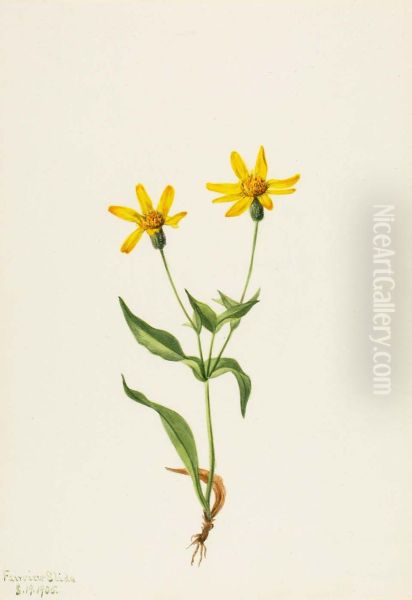 Step into the alpine meadows through Mary Vaux Walcott's exquisite watercolor Arnica alpina (1925), where delicate orange-yellow blossoms dance against a backdrop of lush green foliage. As one of the 400+ botanical illustrations in her seminal North American Wild Flowers series, this work showcases Walcott's scientific precision combined with artistic sensitivity - each velvety petal and serrated leaf rendered with microscopic detail. The Smithsonian artist-naturalist revolutionized botanical art by painting specimens in their natural habitats, elevating field documentation to fine art. Her works bridged 19th-century scientific illustration and modernist nature studies, earning recognition at the 1926 Philadelphia Sesquicentennial Exhibition. The painting's luminous quality comes from her signature technique of layering transparent watercolors over parchment, creating depth that makes the arnica flowers appear to glow with mountain sunlight.