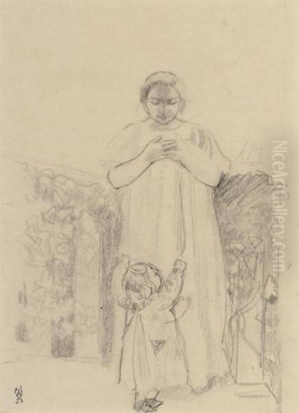 Maternité Sur La Terrasse De Silencio (1916) by Maurice Denis is a luminous celebration of motherhood bathed in the serene light of his beloved Brittany. This intimate composition depicts Denis’ wife Marthe tenderly cradling their newborn on a sun-dappled terrace, enveloped by lush greenery and the soft shimmer of coastal light. As a founding member of Les Nabis, Denis translates domestic bliss into symbolic harmonies – the figures’ simplified forms echo Japanese prints, while the rhythmic patterns of balcony railings and foliage reveal his decorative approach to sacred themes. The painting’s quiet poetry exemplifies Denis’ manifesto that "a picture, before being a warhorse or a nude woman, is essentially a flat surface covered with colors assembled in a certain order," bridging Post-Impressionist experimentation with early modernist abstraction. Its spiritual yet accessible treatment of family life secured Denis’ reputation as France’s preeminent Catholic modernist.