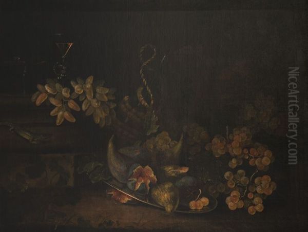 Maximilian Pfeiler's Obst- und Gemüsestillleben (Fruit and Vegetable Still Life) is a vibrant celebration of natural abundance, radiating warmth and vitality through its meticulously arranged composition. Painted in the late 19th or early 20th century, this work exemplifies the enduring tradition of still life painting, where Pfeiler masterfully balances realism with subtle artistic flourishes. The artwork belongs to the broader context of European still life traditions, echoing the Dutch Golden Age's attention to detail while infusing a distinct Central European sensibility. Pfeiler’s skillful play of light and shadow brings textures to life—glistening fruit skins, leafy greens, and rustic baskets feel almost tangible. Though not as widely recognized as some canonical still life masters, Pfeiler’s piece holds charm for its accessibility and everyday poetry, bridging the gap between fine art and domestic appeal.
