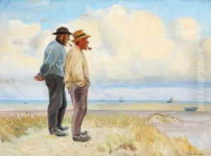 The Skagen fishermen Rasmus Bergen Sorensen and Boj Andersen standing on the beach.