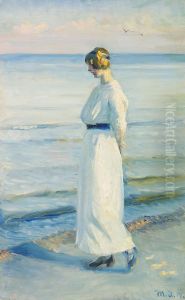 Ung kvinde i hvid sommerkjole pa Skagen Strand.