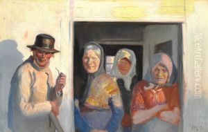 Fru Kroyer gar forbi Kristoffers hus. Studie.