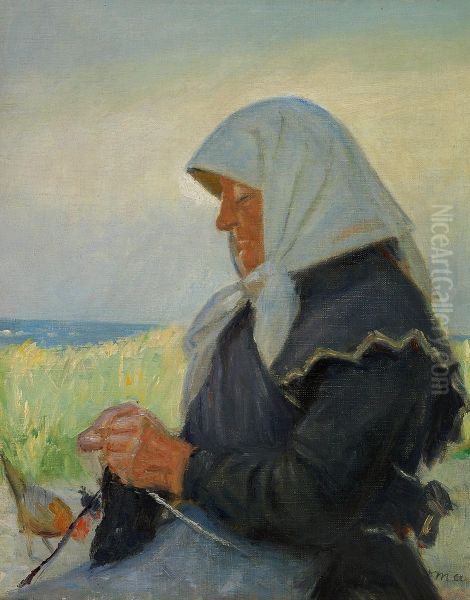 The painting Strikkende fiskerkone i klitterne (2) by Michael Peter Ancher captures a serene yet profound moment in the daily life of a Danish fishing community. Bathed in soft natural light, the elderly fisherwoman sits knitting amid the dunes, her weathered hands and calm expression embodying resilience and quiet dignity. Ancher, a central figure of the Skagen Painters, masterfully blends realism with subtle impressionistic touches—particularly in the play of light on her apron and the delicate rendering of the sand. Created in the late 19th century, this work exemplifies the Skagen movement’s focus on local life and natural beauty, bridging Danish Golden Age traditions and emerging modernism. Its historical significance lies in its authentic portrayal of rural labor, challenging romanticized narratives while celebrating human connection to landscape.
