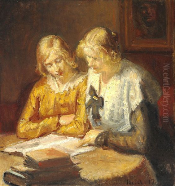 The painting To unge piger sidder ved bordet og laeser i en bog (Two Young Girls Sitting at a Table Reading a Book) by Danish artist Michael Peter Ancher (1849–1927) captures a quiet yet deeply evocative domestic scene. Painted in 1900, it belongs to the Skagen Painters movement, a group known for their naturalistic depictions of rural Danish life and coastal landscapes. Ancher’s work stands out for its intimate portrayal of everyday moments infused with warmth and subtle emotional depth. The composition centers on two girls engrossed in reading, bathed in soft, diffused light that highlights their serene expressions and the muted textures of their surroundings. Rendered in Ancher’s trademark realist style, the painting balances meticulous detail with an atmospheric looseness, embodying the Skagen School’s fusion of realism and Impressionist sensibilities. Its historical significance lies in chronicling Denmark’s cultural heritage while exemplifying the quiet dignity of ordinary life—a hallmark of late 19th-century Scandinavian art.
