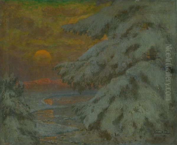 Zapad Slnka v zime (Sunset in Winter) by Nándor Katóna is a mesmerizing landscape painting that encapsulates the serene yet melancholic beauty of a winter sunset. Katóna, an influential Hungarian painter of the late 19th and early 20th centuries, was renowned for his atmospheric landscapes and mastery of light. This work exemplifies his Post-Impressionist style, blending loose brushwork with a harmonious color palette to evoke emotion and depth. The painting captures the quiet stillness of a snow-covered terrain bathed in the golden-pink hues of twilight, with stark trees and distant figures adding a poetic touch. In art history, Katóna’s works bridge the gap between realistic landscape traditions and the expressive, mood-driven approach of modernism. His ability to convey the ephemeral qualities of light and nature places him among the notable Central European artists of his era.