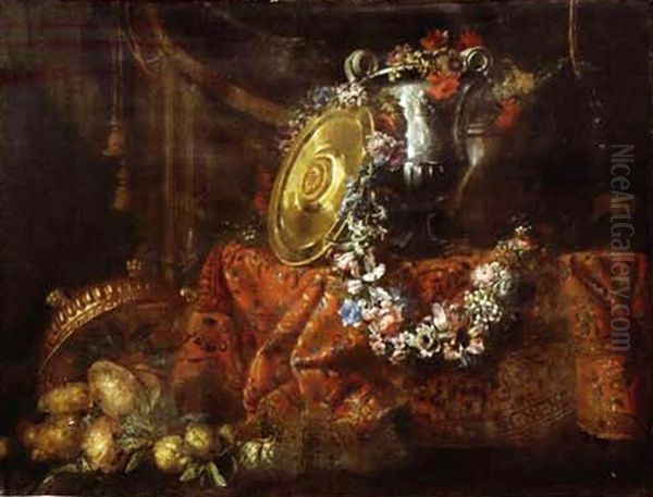 Nature Morte Aux Pieces D'orfevrerie Disposees Sur Un Tapis, Guirlande De Fleurs Et Cedrats