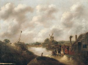 Winter Landscape with Cottages and a Windmill at the Bank of a Frozen River