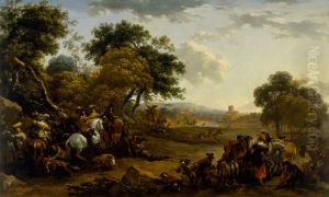 WOODED LANDSCAPE WITH A SHEPHERD AND HIS CATTLE FORDING A STREAM