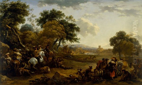 Nicolaes Pieterszoon Berchem’s Landscape with a Hunting Party (c. 1650s–1660s) captures the golden glow of the Dutch Golden Age in a pastoral idyll suffused with movement and light. The painting unfolds as a serene yet dynamic composition—huntsmen on horseback, their dogs darting through sun-dappled foliage, all framed by craggy trees and a softly receding horizon. Berchem, a master of the Italianate landscape, blends Northern European precision with an atmospheric Mediterranean warmth, bathed in the honeyed tones characteristic of his later works. His skill in balancing human activity with nature’s grandeur reflects the 17th-century Dutch fascination with idealized rural life, elevating everyday pursuits into poetic vignettes. Though less revolutionary than his contemporaries Rembrandt or Vermeer, Berchem’s work epitomizes the era’s demand for escapist elegance, securing his place as a bridge between realism and romantic idealism in Baroque landscape painting.