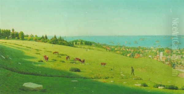 Niels Jørgensen's Udsigt Over New York Set Fra St. George Kystvagten Pa Staten Island is a captivating 19th-century landscape that masterfully captures New York Harbor’s bustling energy and neoclassical serenity. Painted in a Romantic-Realist style, Jørgensen infuses dramatic clouds and shimmering water with meticulous detail, contrasting industrial progress—visible in distant ships and architecture—with Staten Island’s natural coastline. As a Danish artist working in America, Jørgensen bridged European academic traditions with emerging American realism, making this work a rare transatlantic gem. The painting’s historical significance lies in its pre-skyscraper depiction of New York, offering a transitional glimpse of the city before its Gilded Age transformation. Its atmospheric luminosity and balanced composition reflect Hudson River School influences, while its documentary precision aligns with maritime painting traditions, securing its niche in 19th-century urban landscape studies.