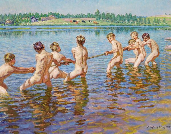 Nikolay Bogdanov-Belsky’s Tug of War is a vibrant portrayal of rural Russian childhood, capturing the infectious energy and camaraderie of village life in the late 19th century. The painting depicts a group of barefoot boys engaged in an enthusiastic tug-of-war game, their faces alight with concentration and joy. Bogdanov-Belsky, a prominent realist and member of the Peredvizhniki (Wanderers) movement, excelled in portraying peasant life with warmth and sincerity. His delicate brushwork and mastery of natural light lend the scene an almost photographic realism, while the earthy tones and expressive figures reflect his academic training under Ilya Repin. Tug of War stands as a testament to his skill in elevating everyday moments into timeless art, earning recognition as a key example of Russian genre painting in the late Imperial era.