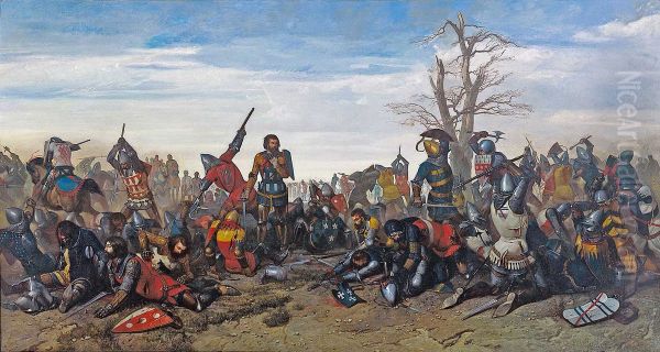 Octave Penguilly l'Haridon's Le Combat des Trente is a striking historical painting that immerses viewers in the dramatic intensity of medieval combat. Depicting the legendary 1351 Battle of the Thirty between Breton and English knights near Ploërmel, the work captures the brutal clash with meticulous detail—gleaming armor, billowing banners, and mud-churned terrain converge in a masterful composition. Rendered in Penguilly l'Haridon's signature Academic style blended with Romanticism’s emotional charge, the painting balances anatomical precision with sweeping movement, each figure radiating heroism or anguish. As a lesser-known gem of mid-19th century French history painting, it offers a fascinating counterpoint to Delacroix’s theatrics while sharing Delaroche’s archaeological rigor—an exquisite study of chivalric spectacle that merits rediscovery alongside Salon contemporaries like Gérôme.