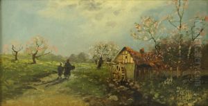 Wintry Landscape With A Sleigh And Huntsmen Conversing. Oil/canvas, Signed