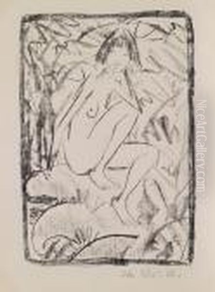 Otto Mueller’s Sitzende, Von Blattwerk Umgeben (helle Fassung) [Seated Woman Surrounded by Foliage (Light Version)] is a captivating example of German Expressionist art, radiating both serenity and raw emotional depth. Created around 1922, the work embodies Mueller’s signature blend of simplified forms and haunting poeticism, influenced by his association with the Die Brücke movement. The painting depicts a seated nude female figure enveloped by delicate foliage, rendered in muted yet luminous tones that evoke a dreamlike harmony between humanity and nature. Mueller’s use of tempera on burlap enhances the textural, almost primal quality of the piece, while the flattened perspective and elongated forms reflect his admiration for non-Western art and folk traditions. Historically, the work exemplifies Mueller’s departure from harsh urban themes toward idyllic, introspective scenes—a shift that positioned him as a quieter yet profound voice within Expressionism. Its restrained palette and lyrical composition make it a standout in early 20th-century art, bridging Romantic sensibility with modernist experimentation.